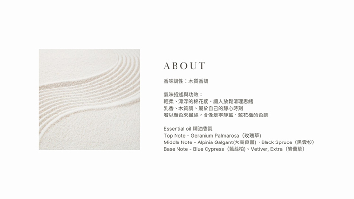 關於香氣的書寫:最初是微微甜而溫暖的大高良薑,輕柔的像漂浮的棉花,可以隨著氣味逐漸放鬆,也將雜亂的思緒疏理一番。中調逐漸沉穩,隨著氣味緩緩放慢呼吸節奏,感受與自己的同在,也會感受到有股溫暖是來自內在。