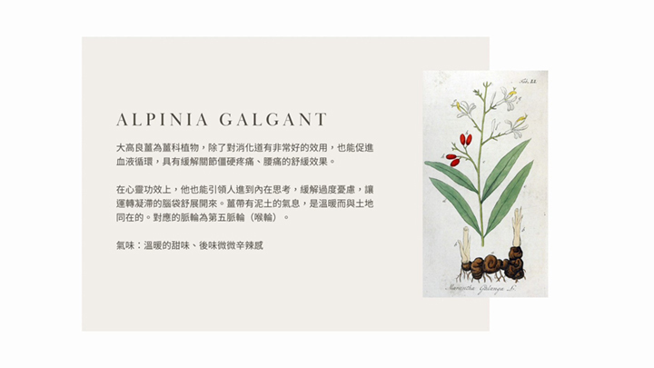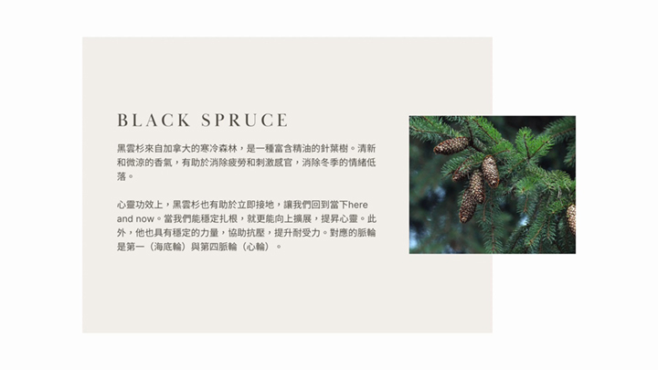 Middle Note - Alpinia Galgant(大高良薑)、Black Spruce(黑雲杉)