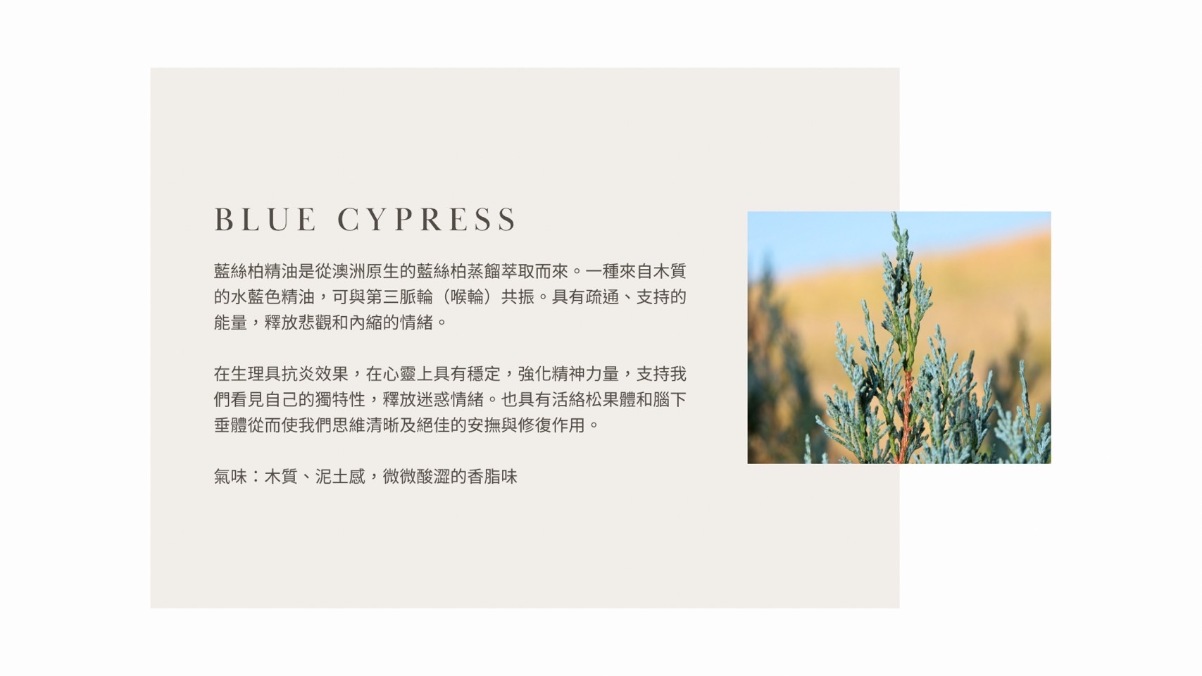 Base Note - Blue Cypress(藍絲柏)、Vetiver, Extra(岩蘭草)